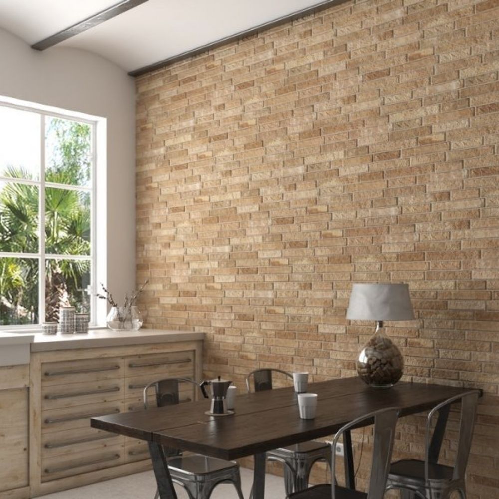 Gres porcelanska glazirana rektificirana za unutrašnje i spoljašnje oblaganje zidova. Mat pločica, imitacija cigli, bež, narandžaste boje. Zidna pločica, za postavljanje unutra ili napolje. Blago je reljefna,