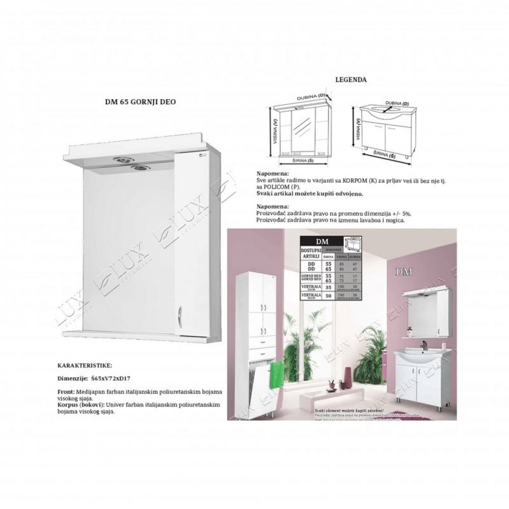 Front: medijapan farban italijanskim poliuretanskim bojama visokog sjaja. Korpus (bokovi): univer farban italijanskim poliuretanskim bojama visokog sjaja. proizvođač: lux ceramica, mladenovac