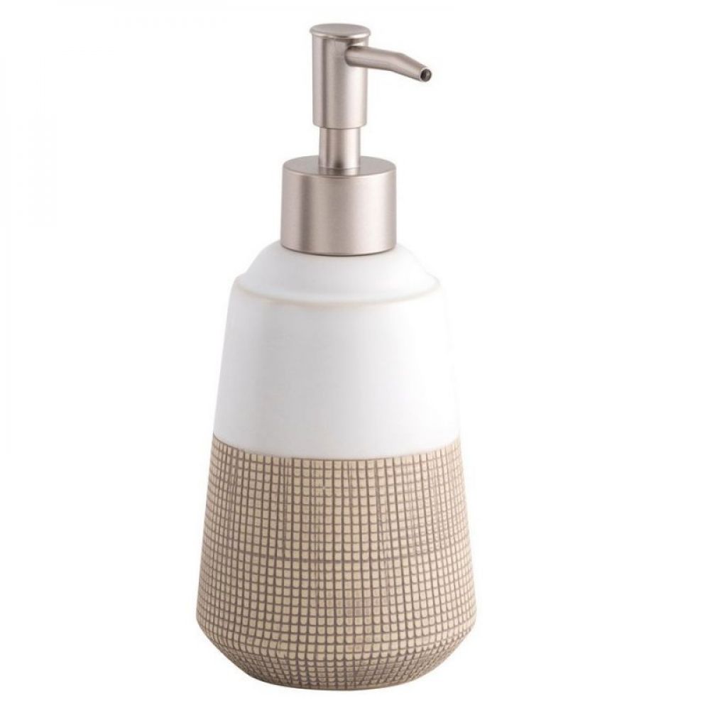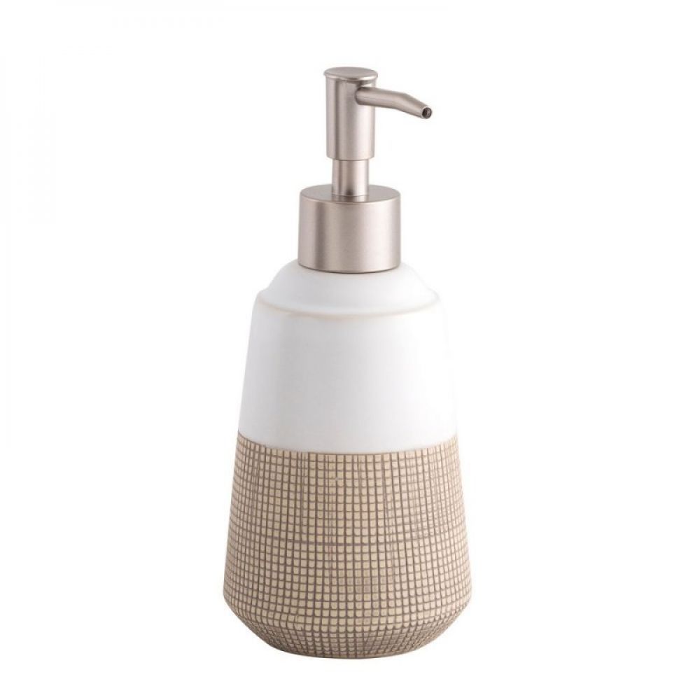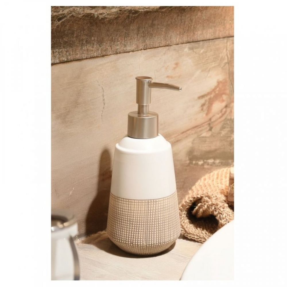 Opis: Dozator za sapun iz serije ISANA. Kućište je napravljeno od kamena. Donji deo je braon boje i ima žlebove za lakši hvat, dok gornji deo ima glatku površinu i bele je boje. Kapacitet dozatora za sapun je 465 ml.