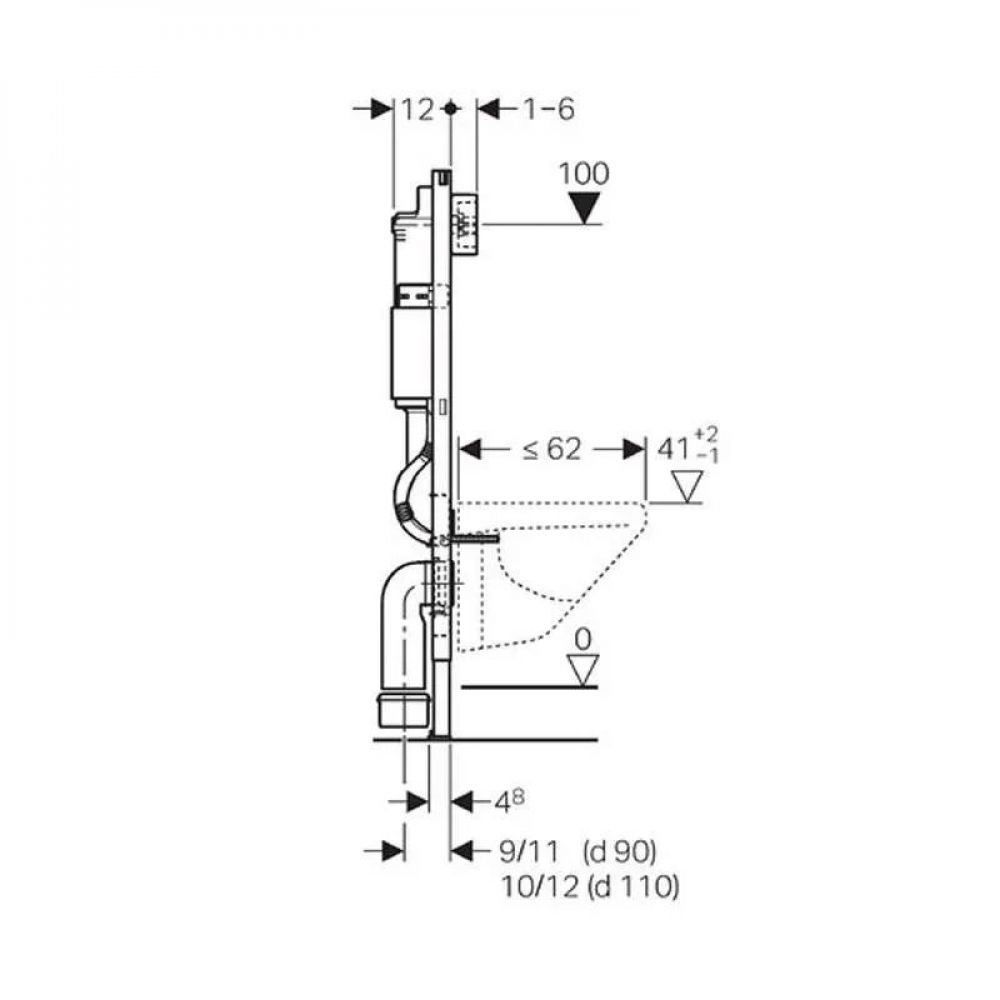 Samonoseći okvir sa završnom obradom pečenim lakom Okvir gore, otvoren Okvir sa rupama ø 9 mm za učvršćenje u konstrukciji od drvenih okvira Okvir sa prihvatnim otvorima za Geberit Duofix zidno sidro za elemente sa otvorenim okvirom gore Pripremljen okvir za podupirače kod WC keramike sa malom oslonom površinom Potporne noge pocinkovane Potporne noge, podesive od 0–20 cm Ploče stope od plastike Dubina ploče stope odgovara za ugradnju u U-profile UW 50 Priključno koleno koje se može montirati bez alata Ugradni vodokotlić sa aktiviranjem sa prednje strane Ugradni vodokotlić sa izolacijom protiv kondenzacije Kod fabričkog podešavanja moguće je automatsko naknadno ispiranje Priključak za vodu, pozadi ili gore na sredini Opremljen praznom cevi za dovod vode ka priključku Geberit AquaClean uređaja za WC tuš Sa mogućnošću učvršćenja za priključak električnog napajanja Element sadrži: Ugaoni ventil R 1/2, kompatibilan sa MF adapterom, sa priključnim prstenom Građevinska zaštita za revizioni otvor, od polistiren pene 2 vijka za okvir tipke 2 zidna sidra Priključni set za WC, ø 90 mm Priključno koleno 90° od PE-HD, ø 90 mm Spojnica za prelaz od PE-HD, ø 90 / 110 mm 2 zaštitna čepa Traverza za podmetač za oblogu 2 navojne šipke M12 Materijal za pričvršćivanje Garancija: 10 godina