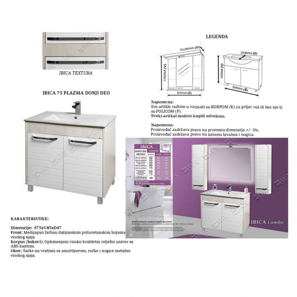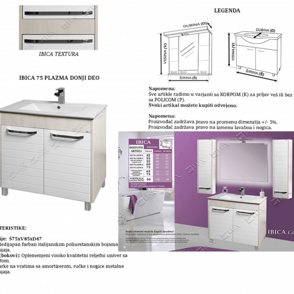 Serija Ibica Front: Medijapan farban italijanskim poliuretanskim bojama visokog sjaja. Korpus (bokovi): Oplemenjeni visoko kvalitetni reljefni univer sa ABS kantom. Okov: Šarke na vratima sa amortizerom, ručke i nogice metalne visokog sjaja.