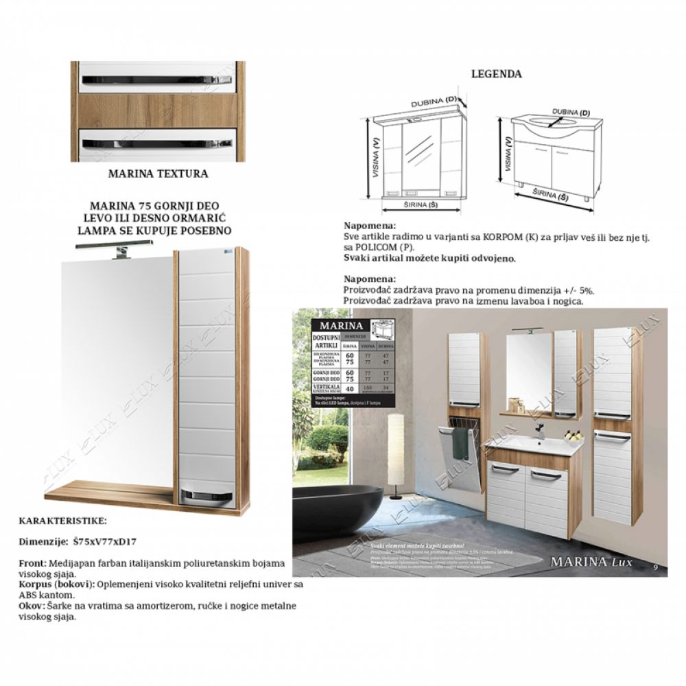 Serija Marina Front: Medijapan farban italijanskim poliuretanskim bojama visokog sjaja. Korpus (bokovi): Oplemenjeni visoko kvalitetni reljefni univer sa ABS kantom. Okov: Šarke na vratima sa amortizerom, ručke i nogice metalne visokog sjaja.