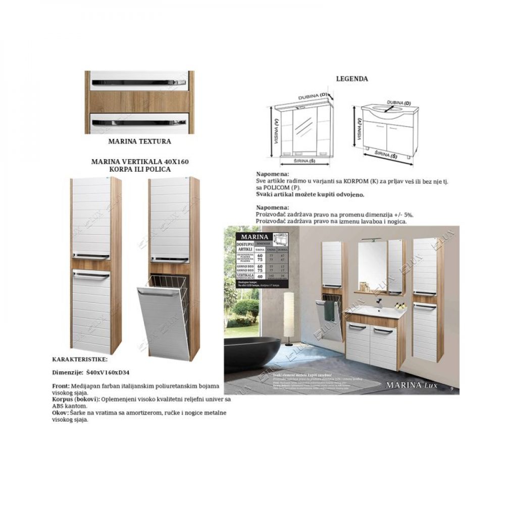 Serija Marina Front: Medijapan farban italijanskim poliuretanskim bojama visokog sjaja. Korpus (bokovi): Oplemenjeni visoko kvalitetni reljefni univer sa ABS kantom. Okov: Šarke na vratima sa amortizerom, ručke i nogice metalne visokog sjaja.