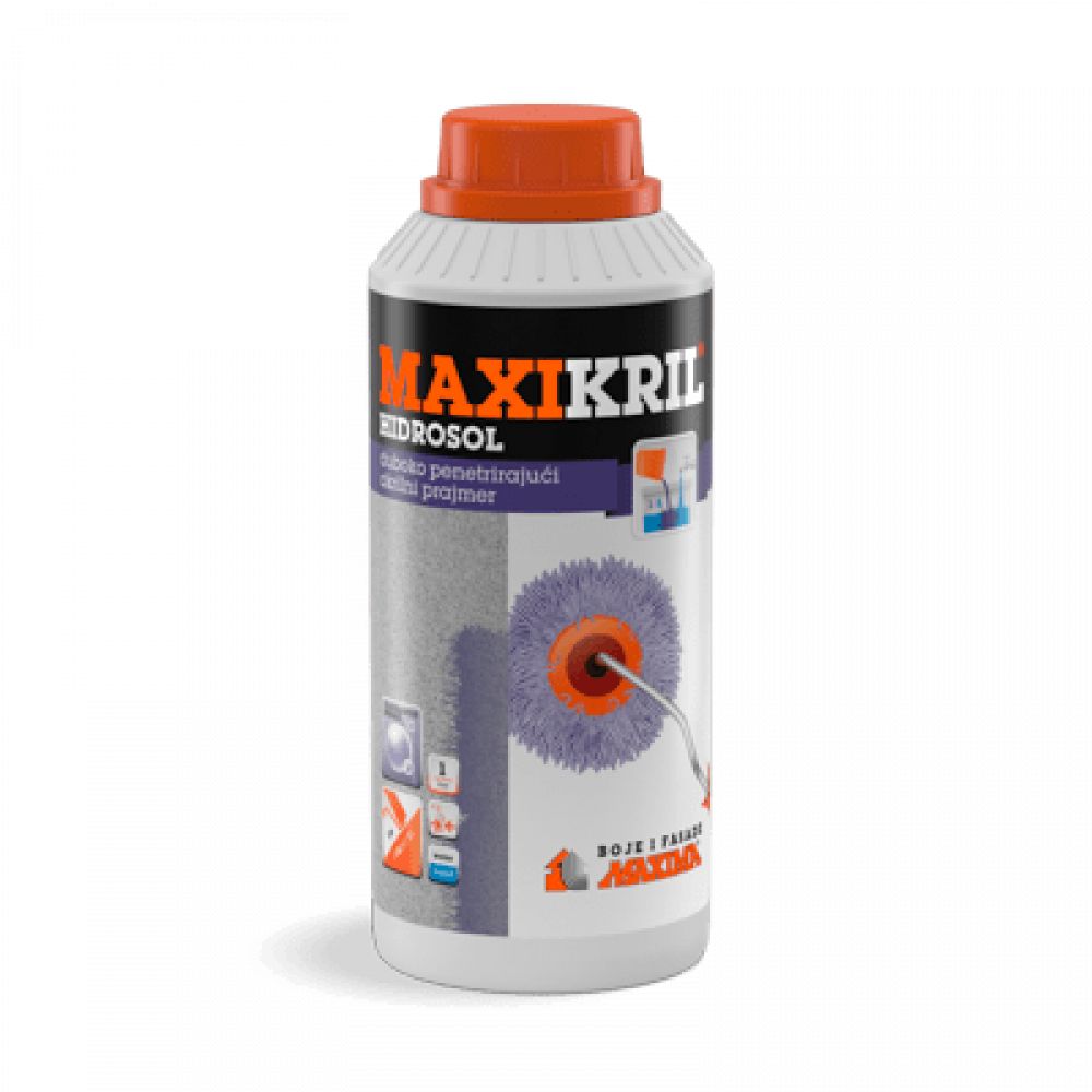 MAXIKRIL Hidrosol je specijalni akrilni dubinski premaz namenjen za impregnaciju glatkih mineralnih i betonskih spoljašnjih i unutrašnjih površina, kao i gips kartonskih ploča. Posebno se savetuje kod manje čvrstih površina, pre nanošenja boja i dekorativnih maltera. Duboko penetrira u podlogu, ujednačava je, učvršćuje, povećava joj otpornost na vodu, poboljšava adheziju završnih materijala i smanjuje njihovu potrošnju. MAXIKRIL Hidrosol ne koristiti ako se za završne radove ugrađuju materijali na silikatnoj ili silikonskoj osnovi.