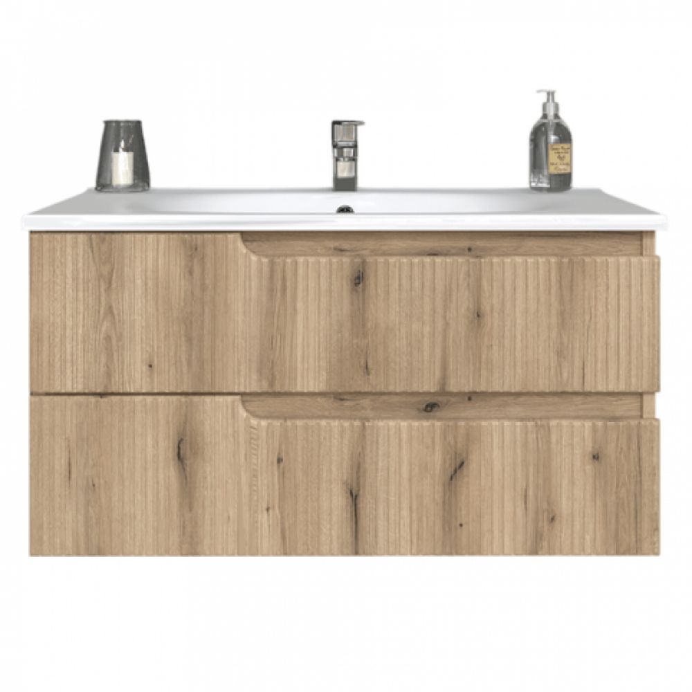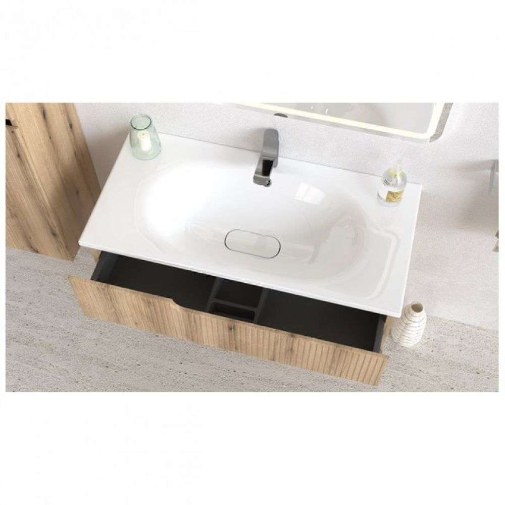 Njegova topla tekstura hrasta stvara prijatan ambijent, dok široka površina od 100cm i kvalitetan umivaonik od livenog mermera pružaju udobnost i praktičnost za svakodnevnu upotrebu.
