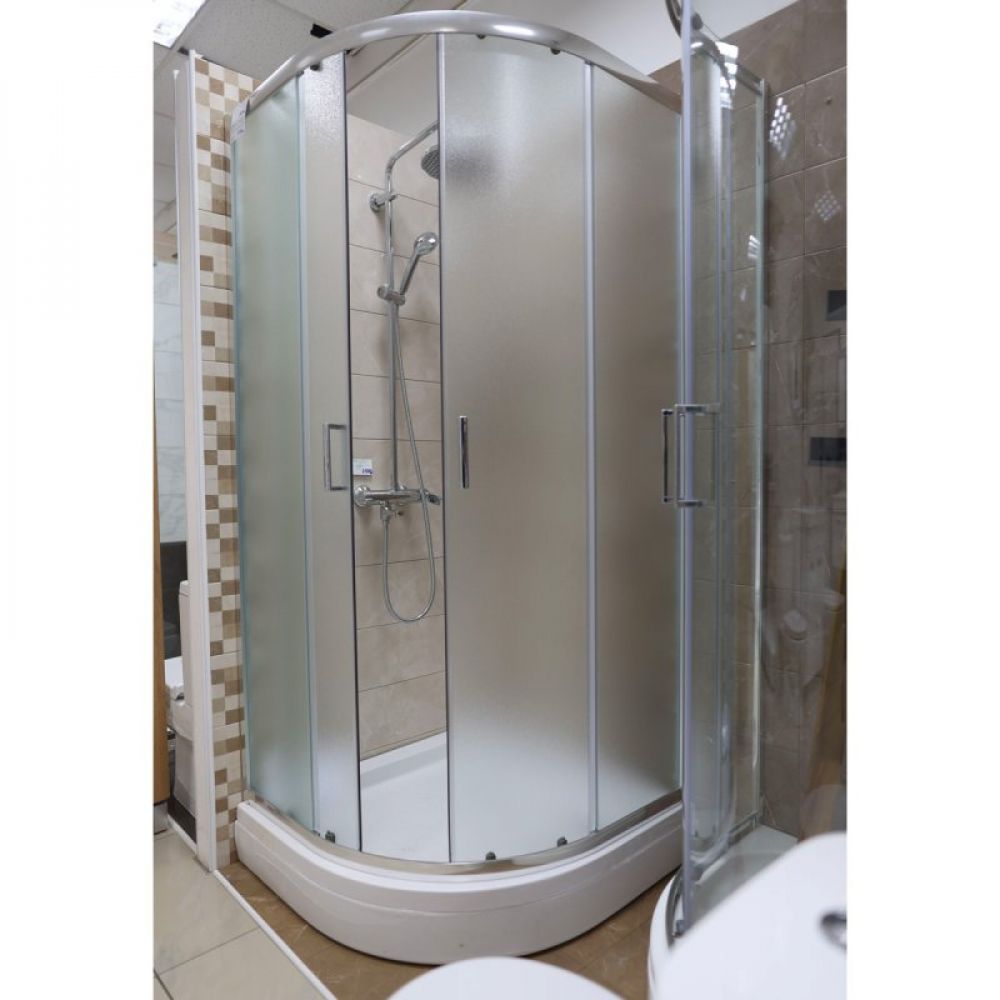 Polukružni tuš paravan. Visina 190 cm, modeli dimenzija R80 i R90. Mat staklo i hrom sjajne lajsne i ručice.
