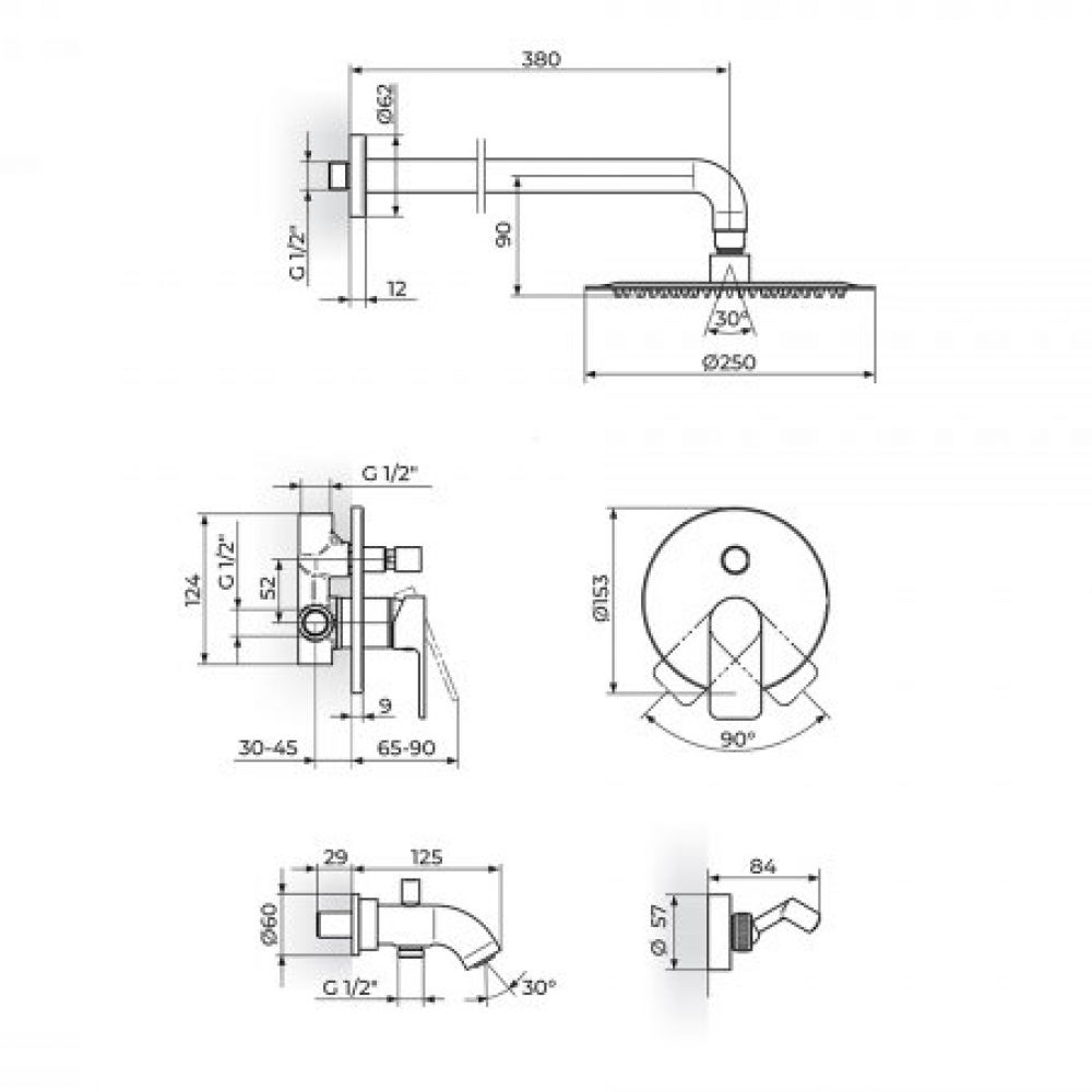 Vrsta robe: Uzidna baterija sa izlivom, zidnim tušem D.250mm i ručnim tušem