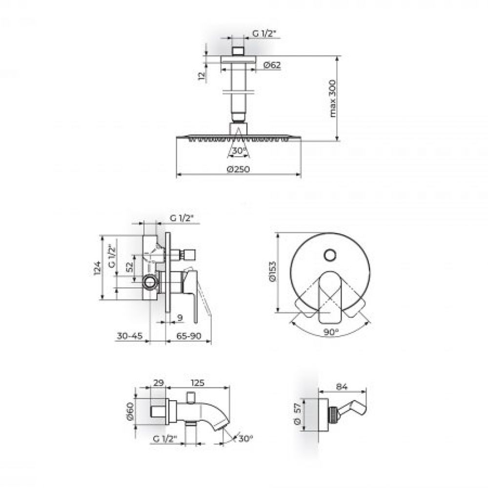 Vrsta robe: Uzidna baterija sa izlivom, zidnim tušem D.250mm i ručnim tušem