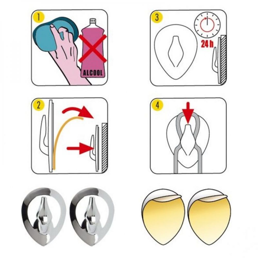 Polica se postavlja bez bušenja pločica sa specijalnim samolepljivim kukicama koje se nalaze u pakovanju. Šrafovi i tiplovi su u svakom slučaju u pakovanju u slučaju potrebe za trajnim fiksiranjem na zid.